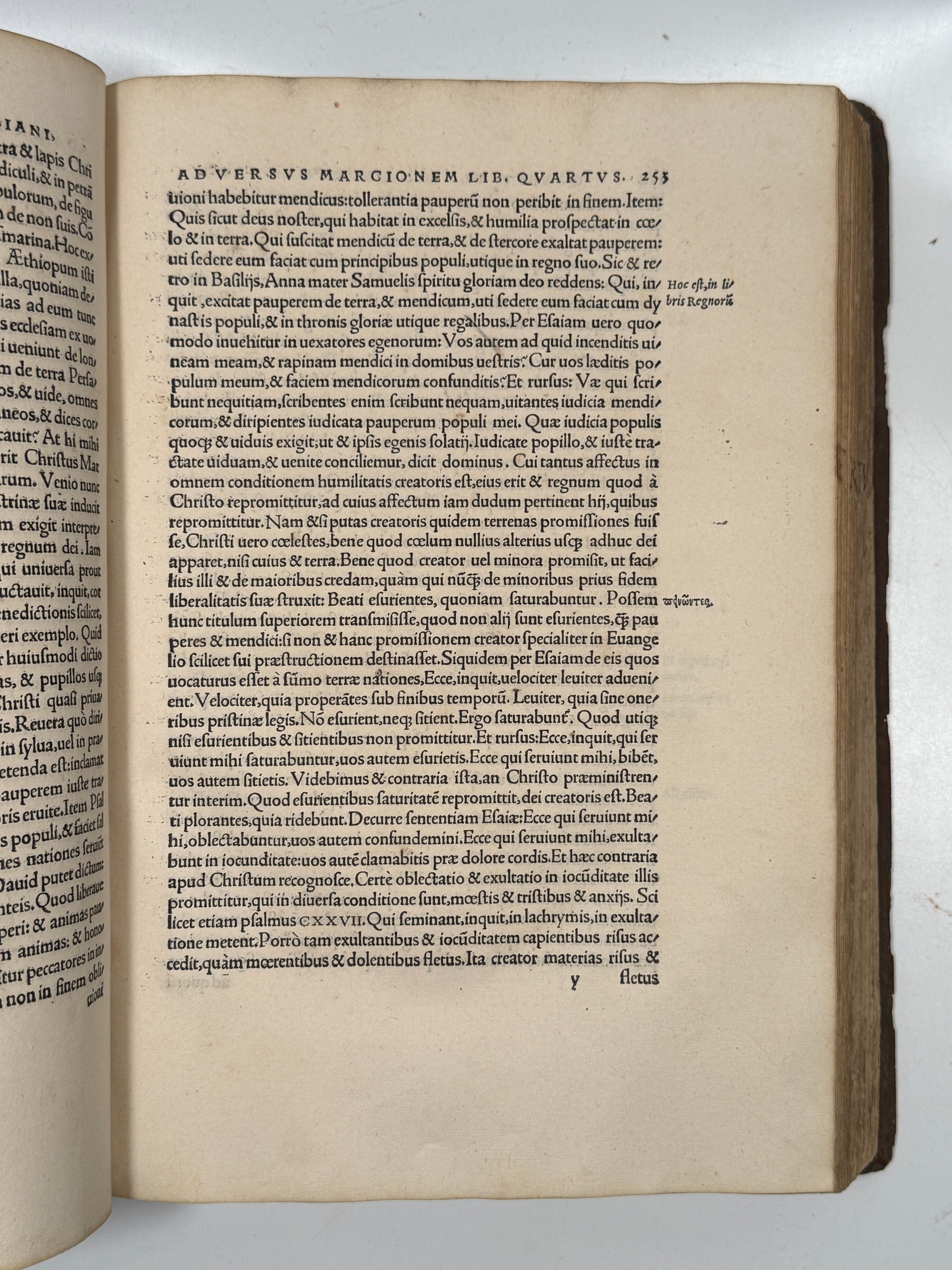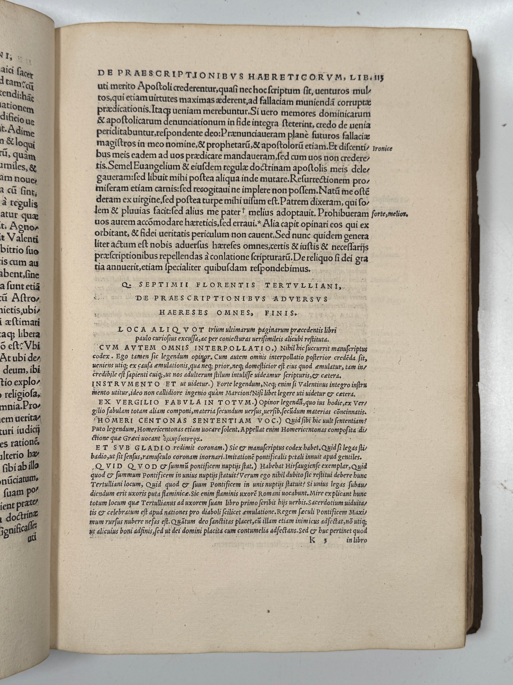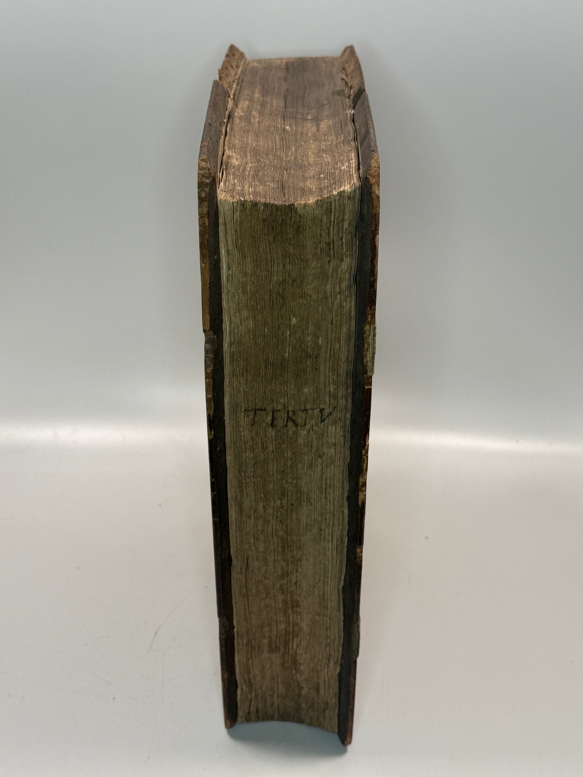 This edition was prepared by the Alsatian humanist Beatus Rhenanus, one of the most important scholars of the early sixteenth century and a close collaborator of Johann Froben. A student of Lefèvre d’Étaples and Erasmus’s trusted associate, Rhenanus devoted his career to recovering and editing patristic and classical texts. His work on Tertullian was significant: by bringing the writings of the earliest Latin Church Father “out of darkness” (e tenebris eruta), Rhenanus supplied both Catholic and Protestant theologians with a critical text of immense polemical and doctrinal utility. This Froben folio thus stands at the intersection of Renaissance humanist scholarship and Reformation-era theology, and became the principal 16th century edition of Tertullian, following the editio princeps just a few years prior in 1521; this being the third edition following a second in 1526, but this was the standard and best edition and was used by John Calvin.