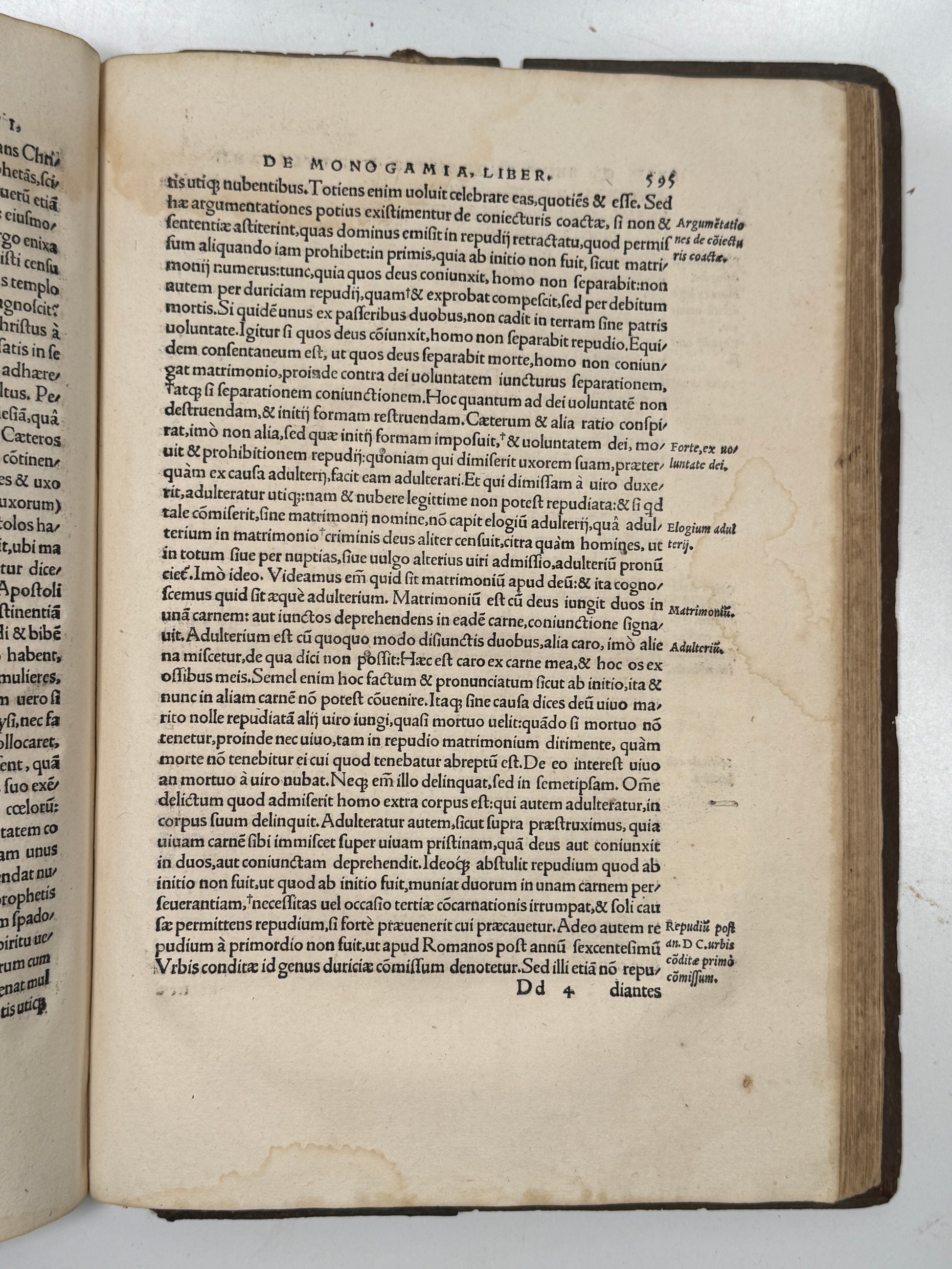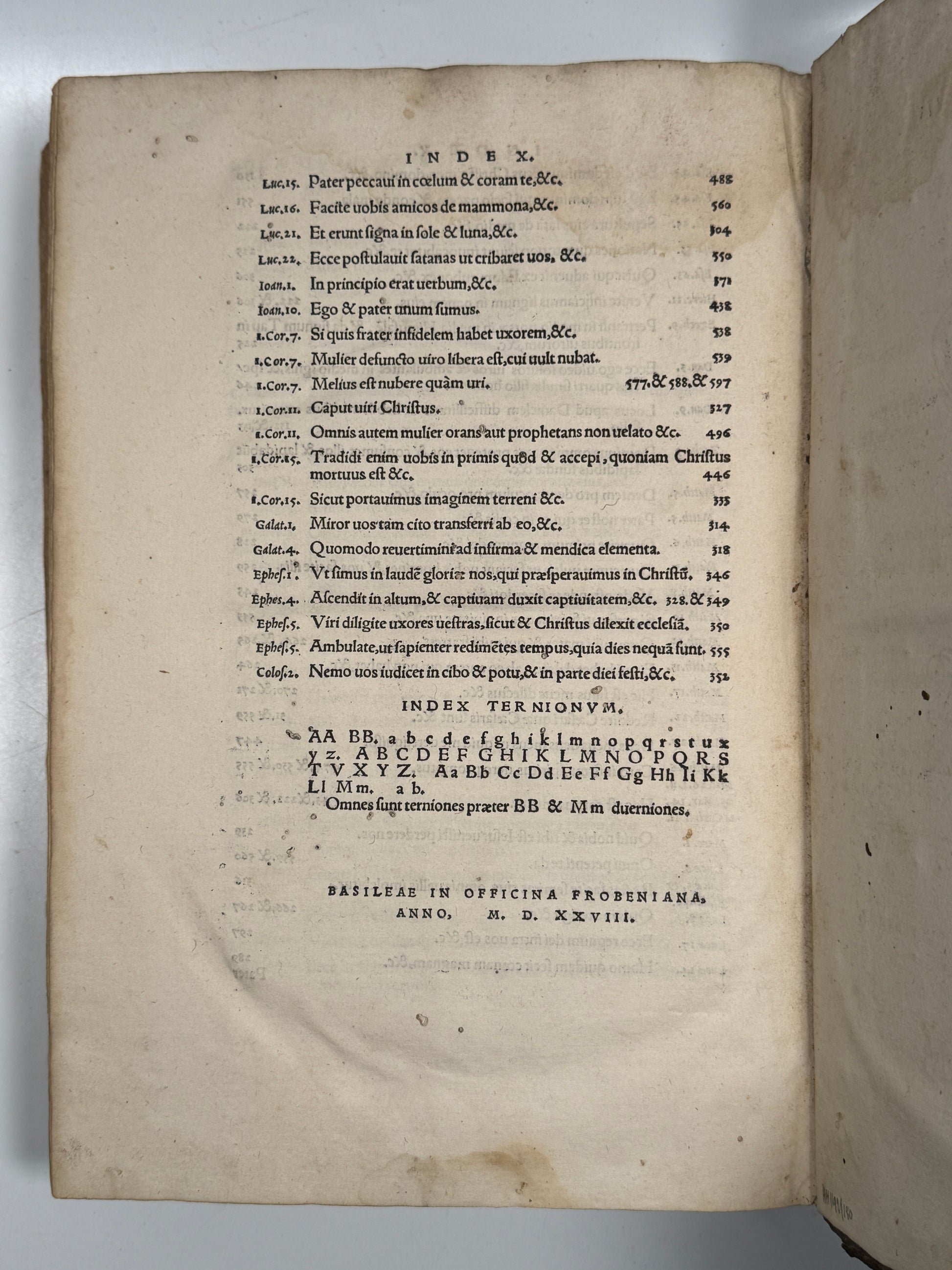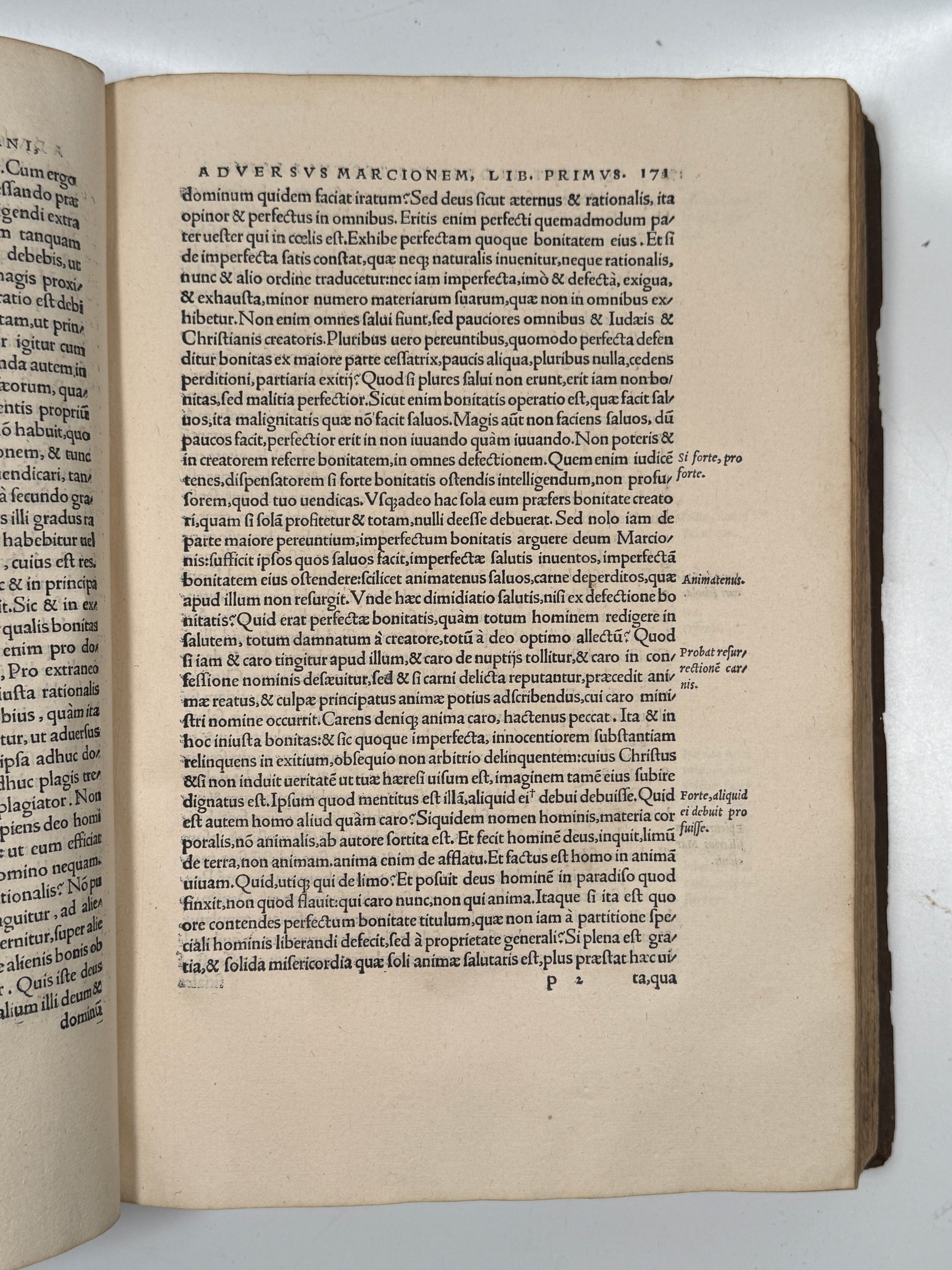 This edition was prepared by the Alsatian humanist Beatus Rhenanus, one of the most important scholars of the early sixteenth century and a close collaborator of Johann Froben. A student of Lefèvre d’Étaples and Erasmus’s trusted associate, Rhenanus devoted his career to recovering and editing patristic and classical texts. His work on Tertullian was significant: by bringing the writings of the earliest Latin Church Father “out of darkness” (e tenebris eruta), Rhenanus supplied both Catholic and Protestant theologians with a critical text of immense polemical and doctrinal utility. This Froben folio thus stands at the intersection of Renaissance humanist scholarship and Reformation-era theology, and became the principal 16th century edition of Tertullian, following the editio princeps just a few years prior in 1521; this being the third edition following a second in 1526, but this was the standard and best edition and was used by John Calvin.