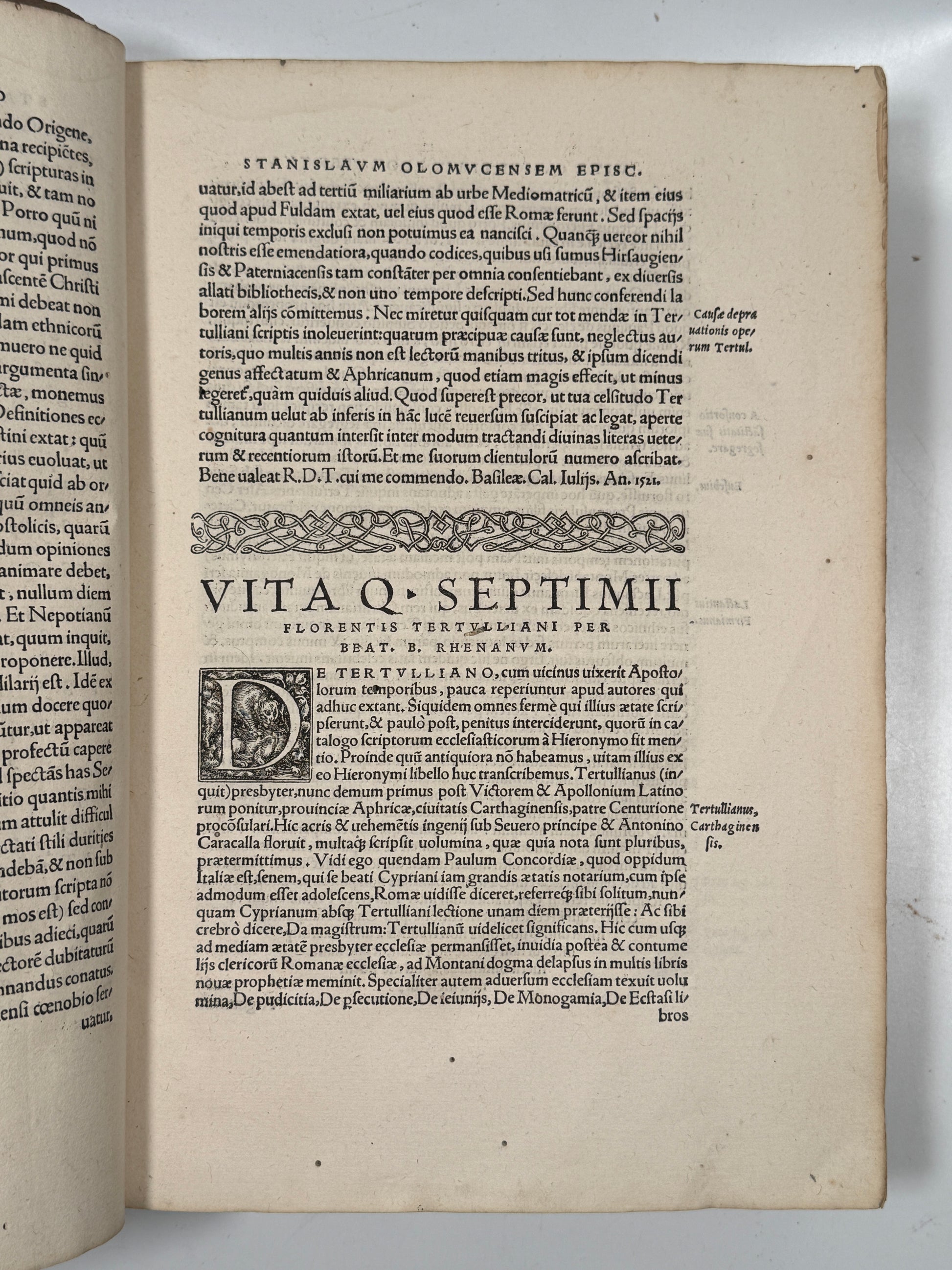 The Works of Tertullian, the first among the Latin writers of the Church, whose writings the blessed Cyprian of old never let a day pass without reading, brought forth from darkness by Beatus Rhenanus of Sélestat […]. Basel: Johannes Froben, 1528, folio.