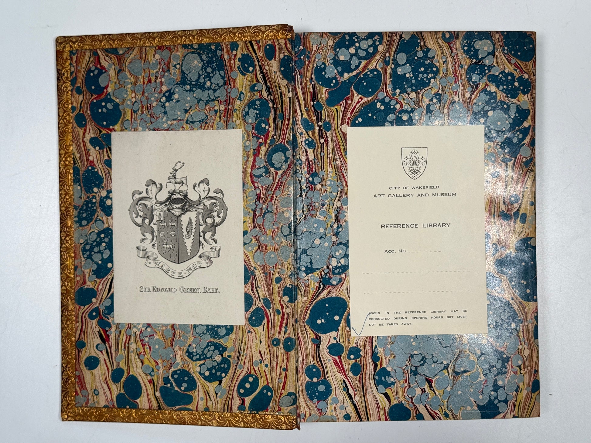 Armorial bookplate of Sir Edward Green, a 19th and early 20th century British MP based in Stowmarket, Thurston, and Bury St Edmunds, Suffolk. He was most likely the original purchaser and the one who commissioned these rather lovely fine bindings from Sotheran & Co. Thereafter in the collection of The City of Wakefield Art Gallery and Museum, thence deaccessioned.
