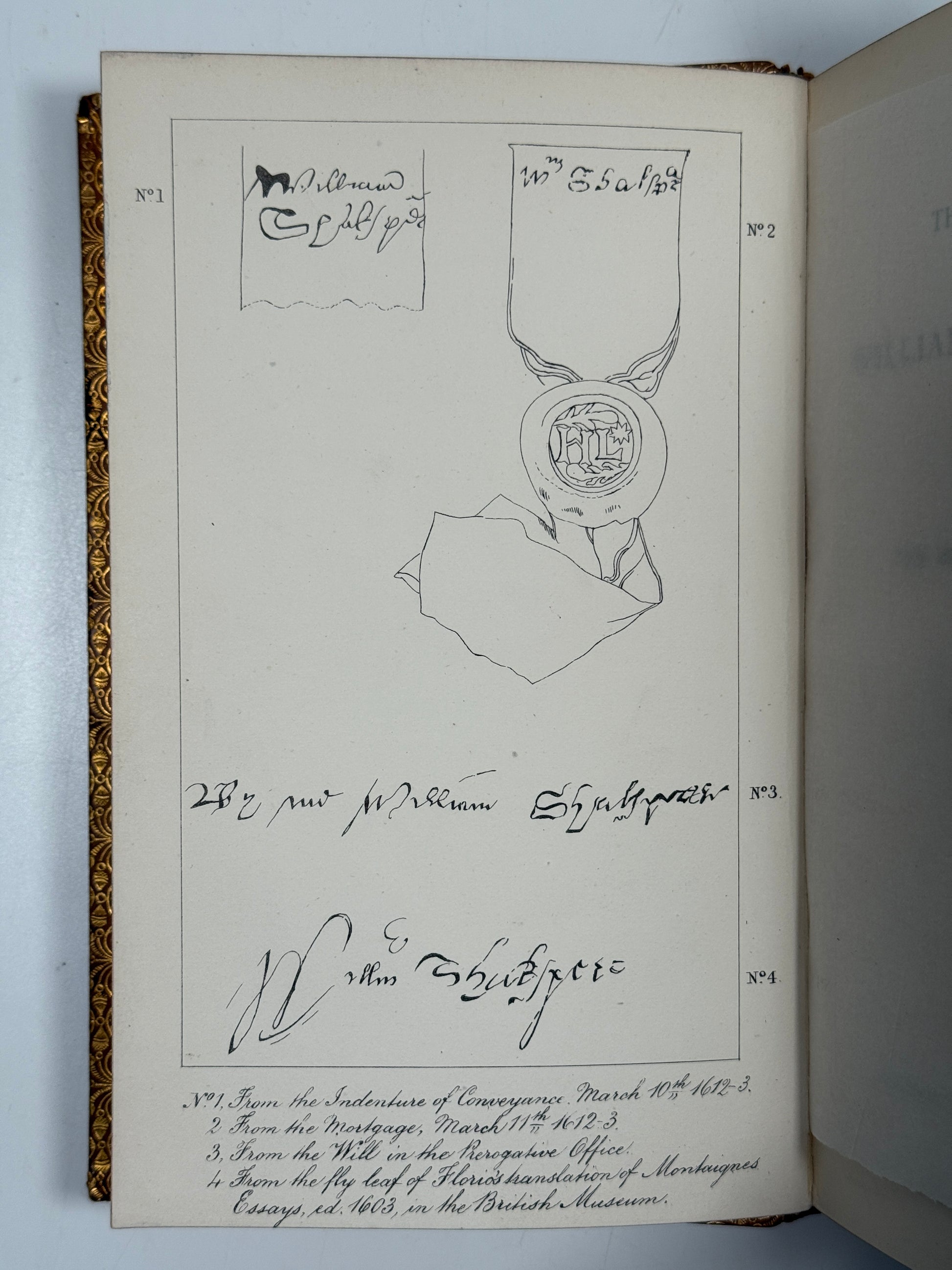 Contemporary full tree calf bindings by Sotheran & Co, signed in gilt to the attractive turn-ins. Spines uniformly sunned, minor rubbing, a few scuffs, but overall an extremely attractive set. All boards securely attached, bindings secure and stand without shelf lean. Bookplate to front pastedowns of Sir Edward Green and another bookplate to ffep recto of the City of Wakefield Art Gallery and Museum (without any further ex-libris marks). Text blocks very clean throughout, essentially in fine condition, free of foxing, stains, etc. One plate as a frontispiece to the first three volumes (two portraits and a facsimile of Shakespeare's four known signatures). Contemporary small sticker to rear board of each volume. A magnificent set of Shakespeare's Works.