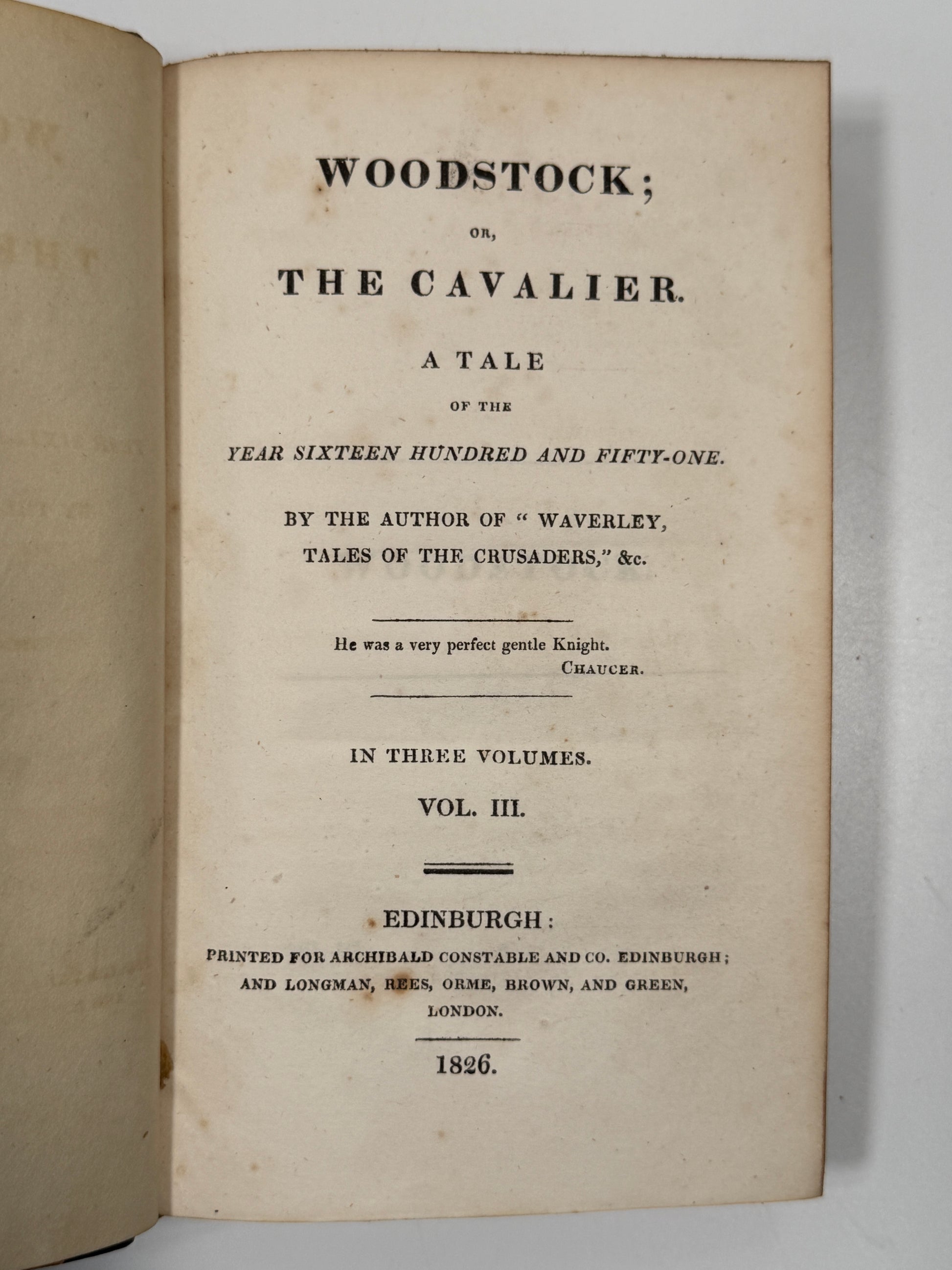Woodstock; or, the Cavelier, a Tale of the Year Sixteen Hundred and Fifty-One. By the Author of "Waverley, Tales of the Crusaders," &c. [Walter Scott]. In Three Volumes. Edinburgh: Printed for Archibald Constable and Co., Edinburgh; and Longman, Rees, Orme, Brown, and Green, London. 1826.