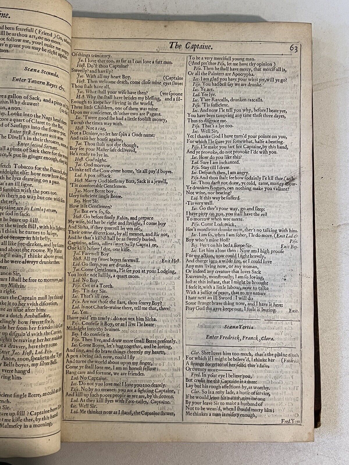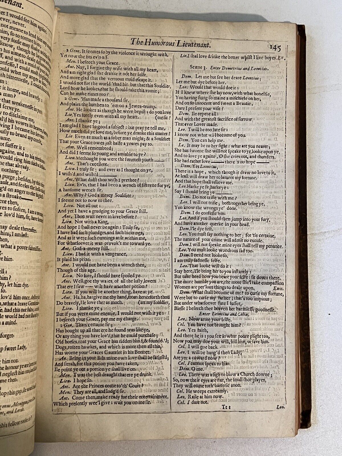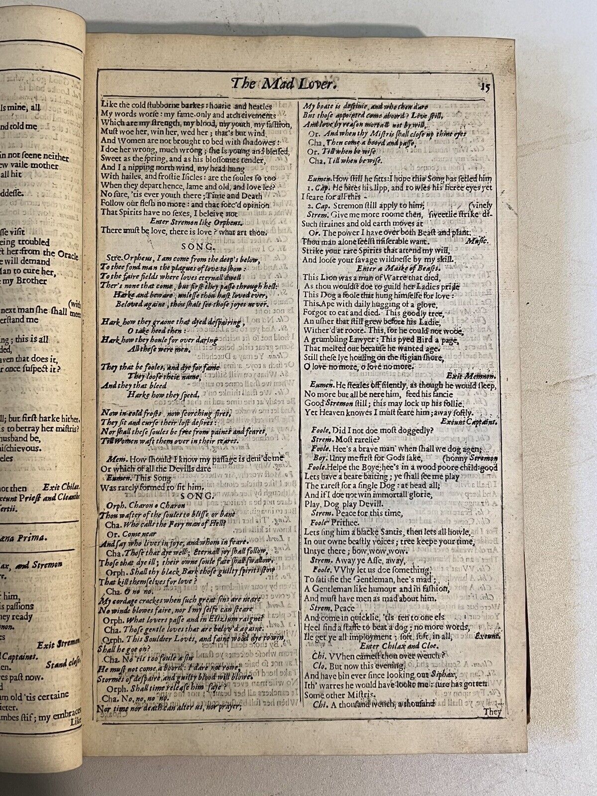 As Allibone remarks, "Beaumont bringing the ballast of judgement, Flether the sail of phantasy... He who has not perused Beaumont and Fletcher can have no complete idea of the riches of English poetry" (Allibone I, 150-151). This first folio is the first printing of the majority of their works, only one play (Wild-Goose Chase) was not included in this folio and that's because the manuscript had been lost; this was separately printed six years later.