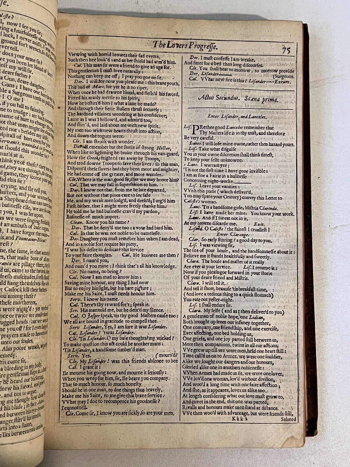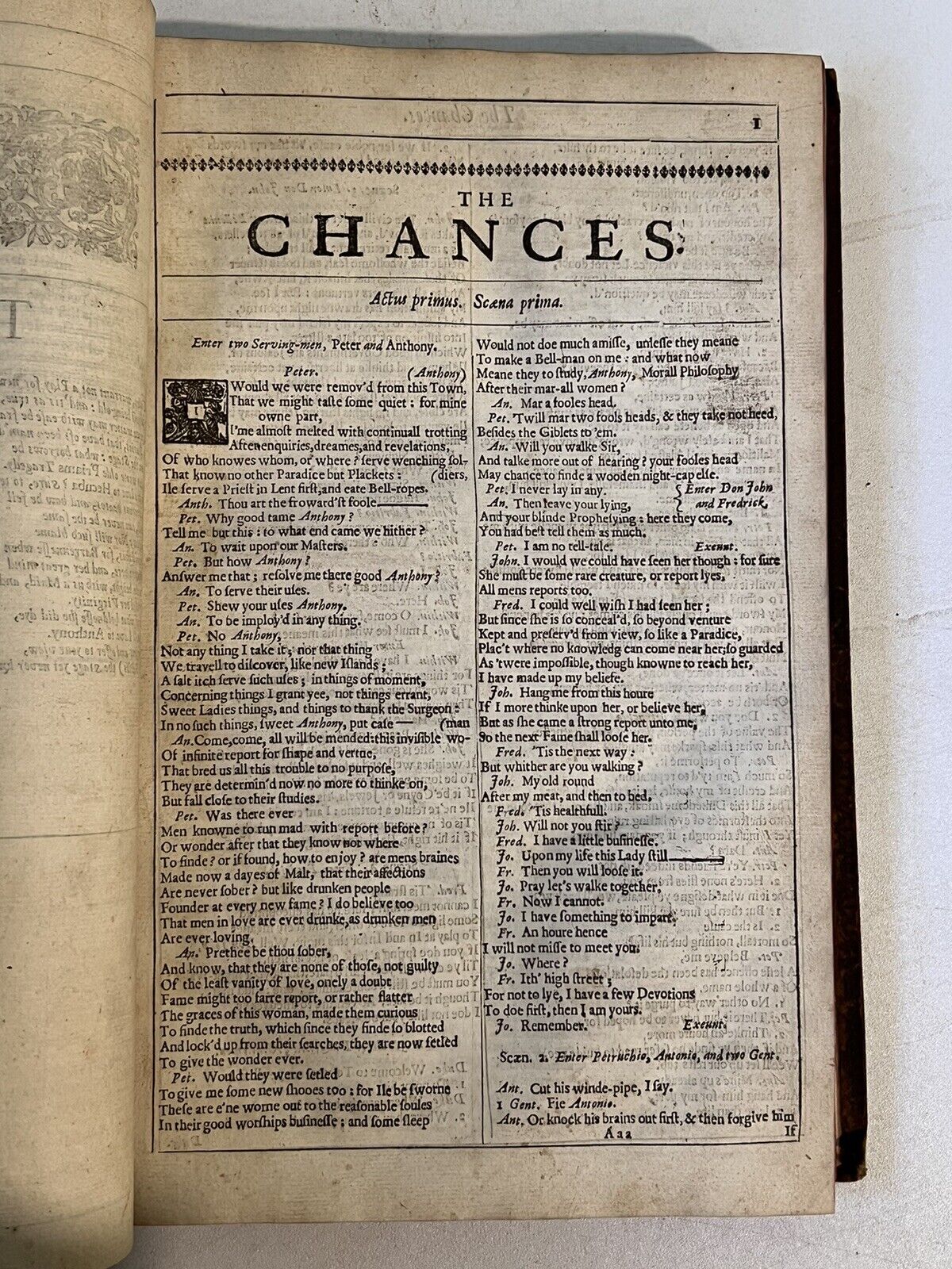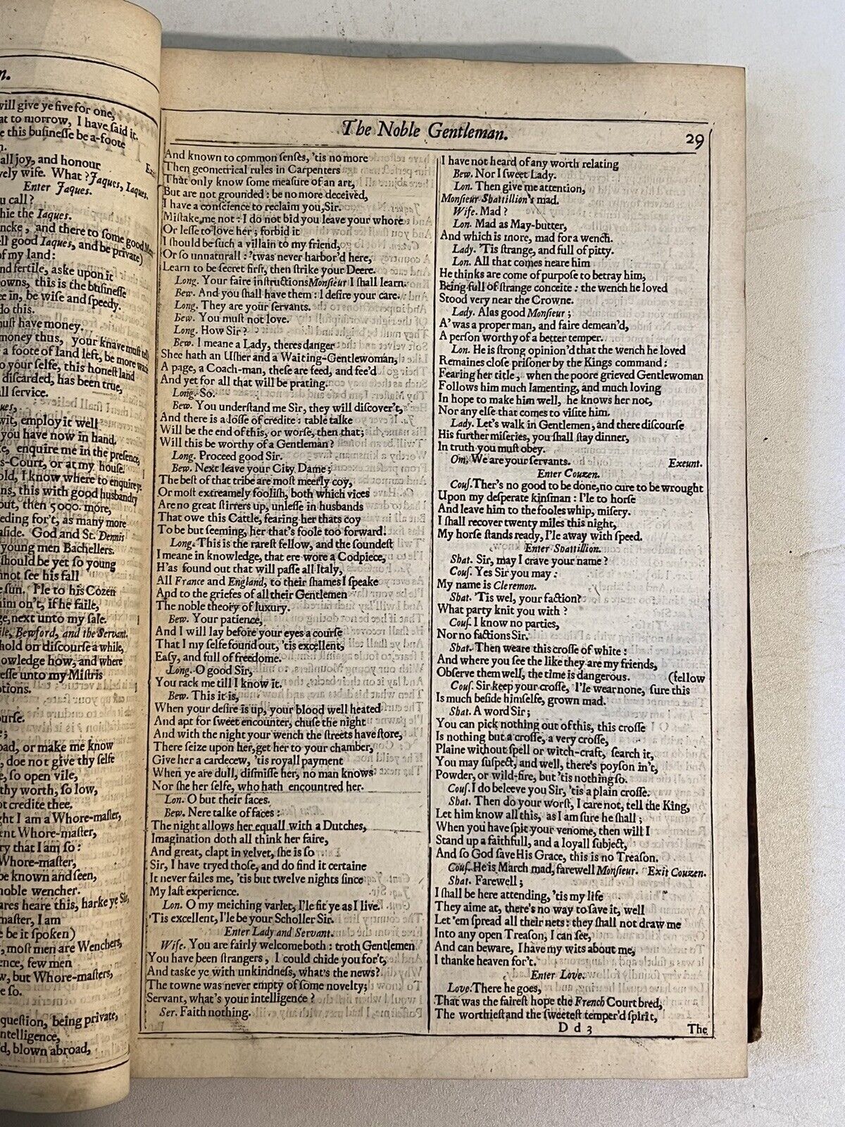 As Allibone remarks, "Beaumont bringing the ballast of judgement, Flether the sail of phantasy... He who has not perused Beaumont and Fletcher can have no complete idea of the riches of English poetry" (Allibone I, 150-151). This first folio is the first printing of the majority of their works, only one play (Wild-Goose Chase) was not included in this folio and that's because the manuscript had been lost; this was separately printed six years later.