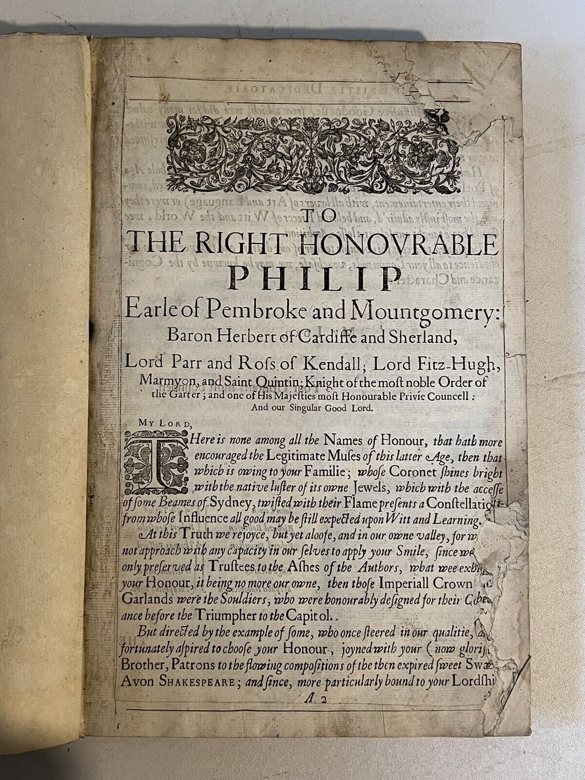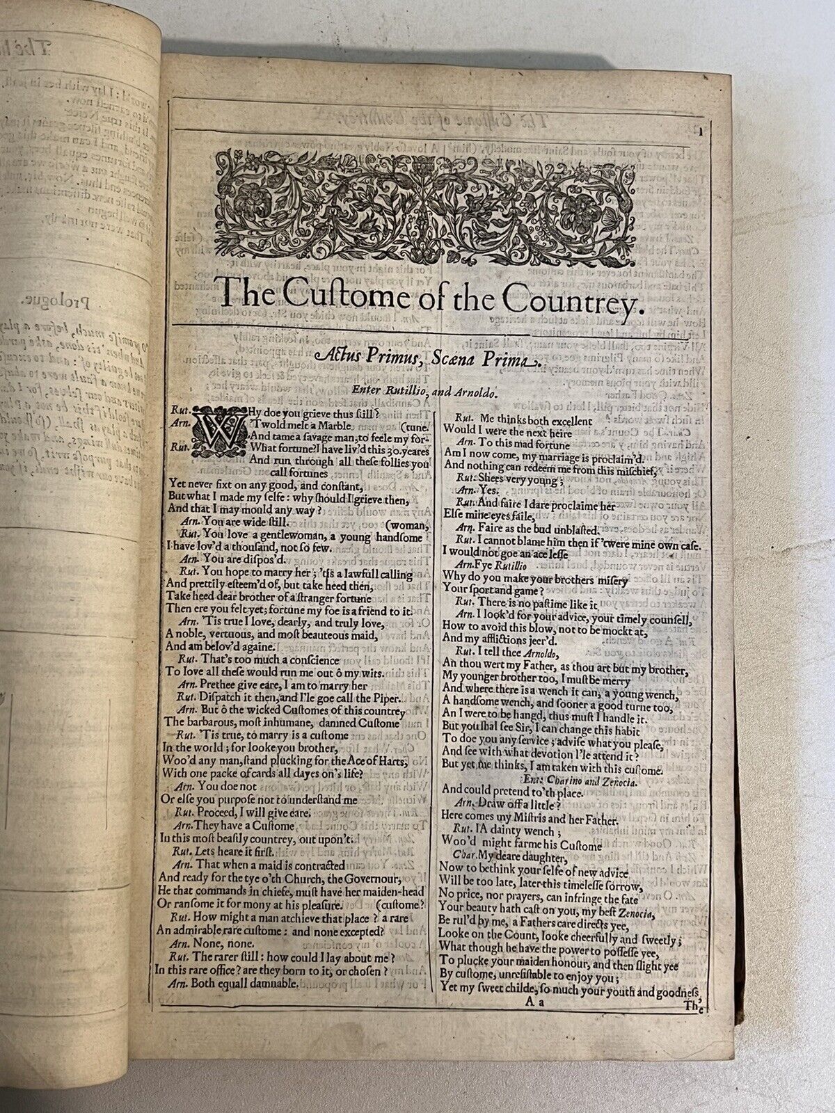 This first folio is practically impossible to find at retail for anywhere under $10,000 which still seems rather inexpensive given just how significant this book is, being one of the three "First Folio[s]" of Elizabethan theatre, with Shakespeare's first folio of course being one of the most expensive books to ever sell, being worth around $10 million. Our copy offered here for sale of Beaumont & Fletcher's first folio is in a near contemporary binding without restoration in a remarkably well preserved state. Extant copies are almost always significantly incomplete but here we find it complete save for just one leaf.
