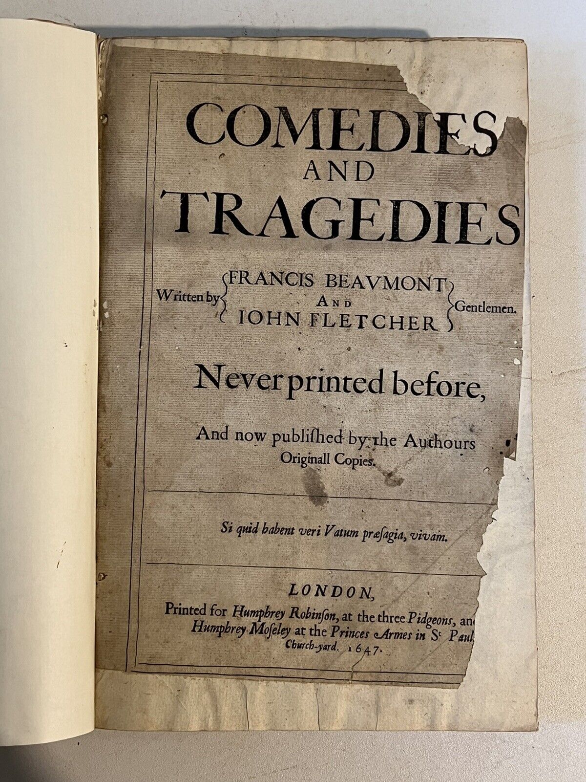 Comedies and Tragedies Written by Francis Beaumont and John Fletcher, Gentlemen. Never Printed Before, And now published by the Authours Originall Copies. London: Humphrey Robinson and Humphrey Moseley, 1647, folio.